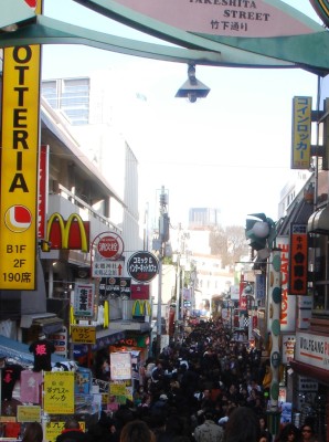 One of the main streets in Harajuku is Takeshita Street, called Takeshita-dori in Japanese. It's narrow, but there are full of teen-oriented shops alongside. The stuff sold there is mostly casual and cheap. Also, you can find some shops that deals clothing of Gothic fashion.