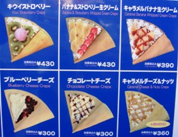 Among more than 50 kinds of crepe, one with slices of banana, chocolate souce, and whipped cream is the most popular. The prices are around 400 yen ($4).